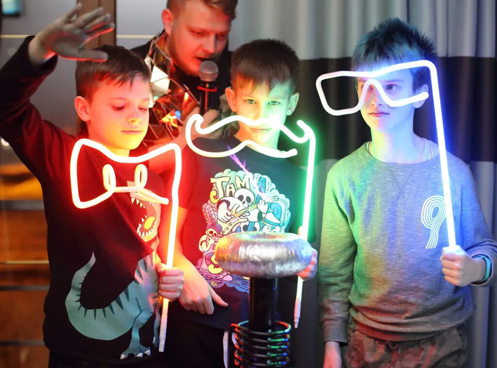 Тесла-шоу для дітей – це знайомство з електрикою і роботою приладів, уміння керувати блискавками і викликати електро-джина. Професіонали нашого агентства протягом півгодини готові зачаровувати науковими експериментами вашу дитину і присутніх гостей.